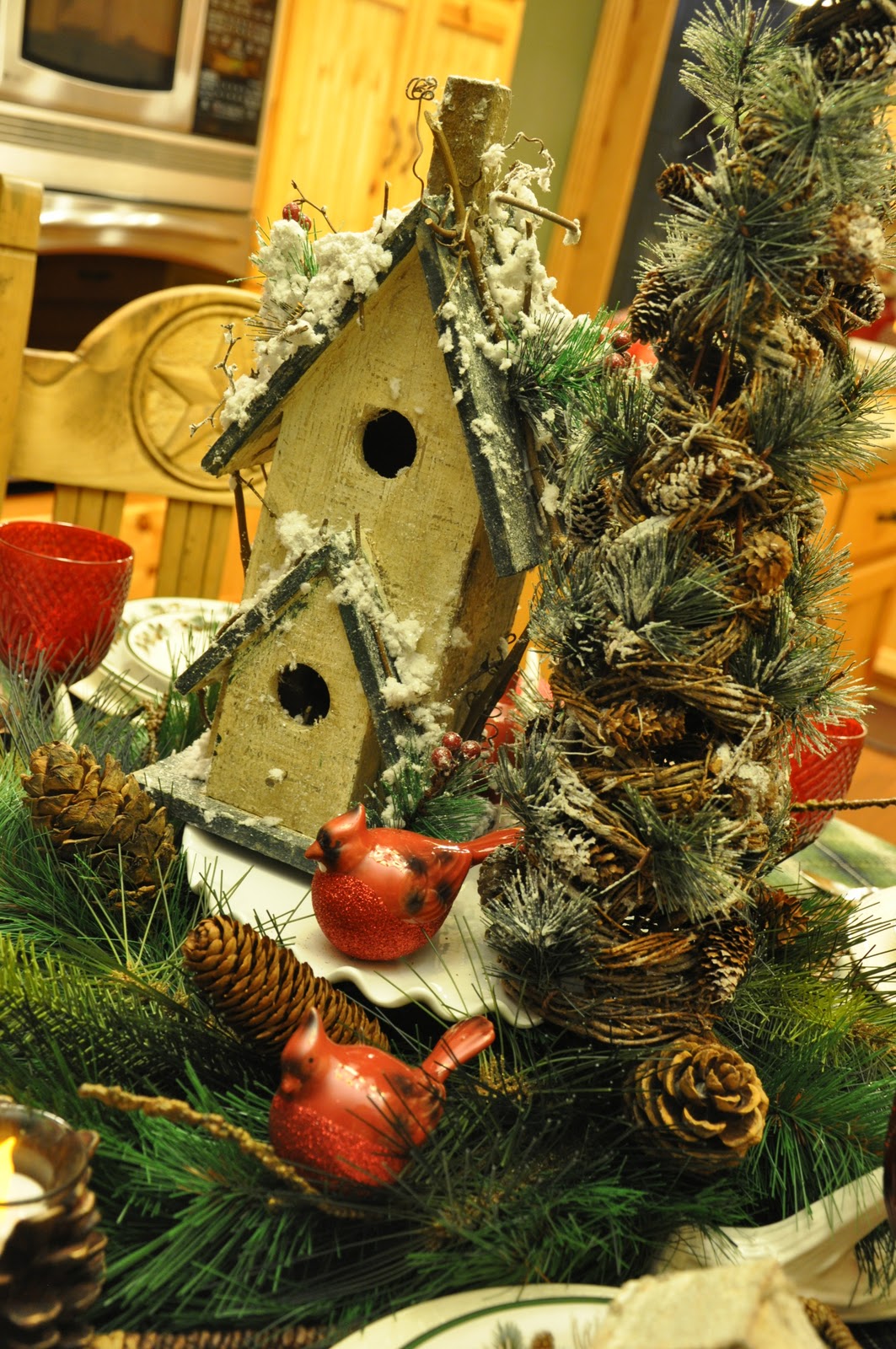 I wanted my table to have the feel of winter, to me nothing says that like pine, maybe its because as a little kid, our christmas tree was always one that we would go out in the woods and cut down, and my mom would always put pine here and there to make it smell yummy in the house. So that is what I used with this table. I used a centerpiece of pine with lots of pinecones, as well as a beautiful snow covered birdhouse, and the prettiest pine trees...in my neck of the woods there would be no snow, but in my vision...let there be snow!